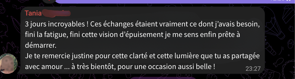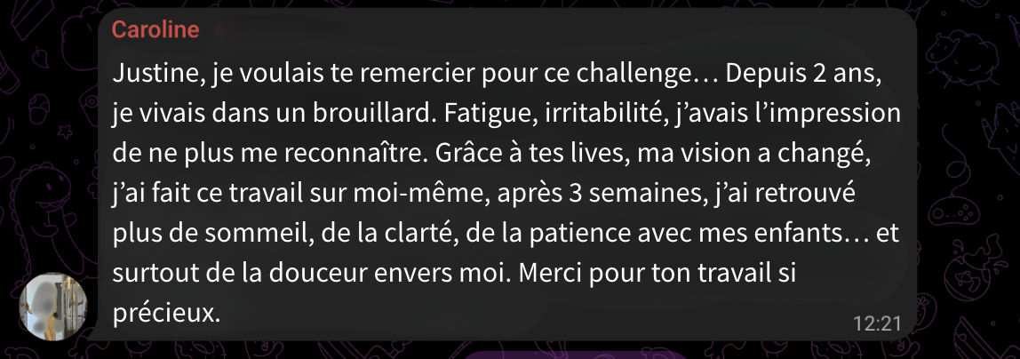 C’est là que je partage les informations importantes, que l’entraide se crée, et que tu peux échanger librement. Je réponds à toutes les questions que tu peux avoir concernant ce challenge et coaching de 3 jours.